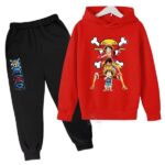 - Hoodie Features: Fiery red hoodie highlighting Luffy’s transformation from child to pirate king, adorned with bright and detailed graphics.